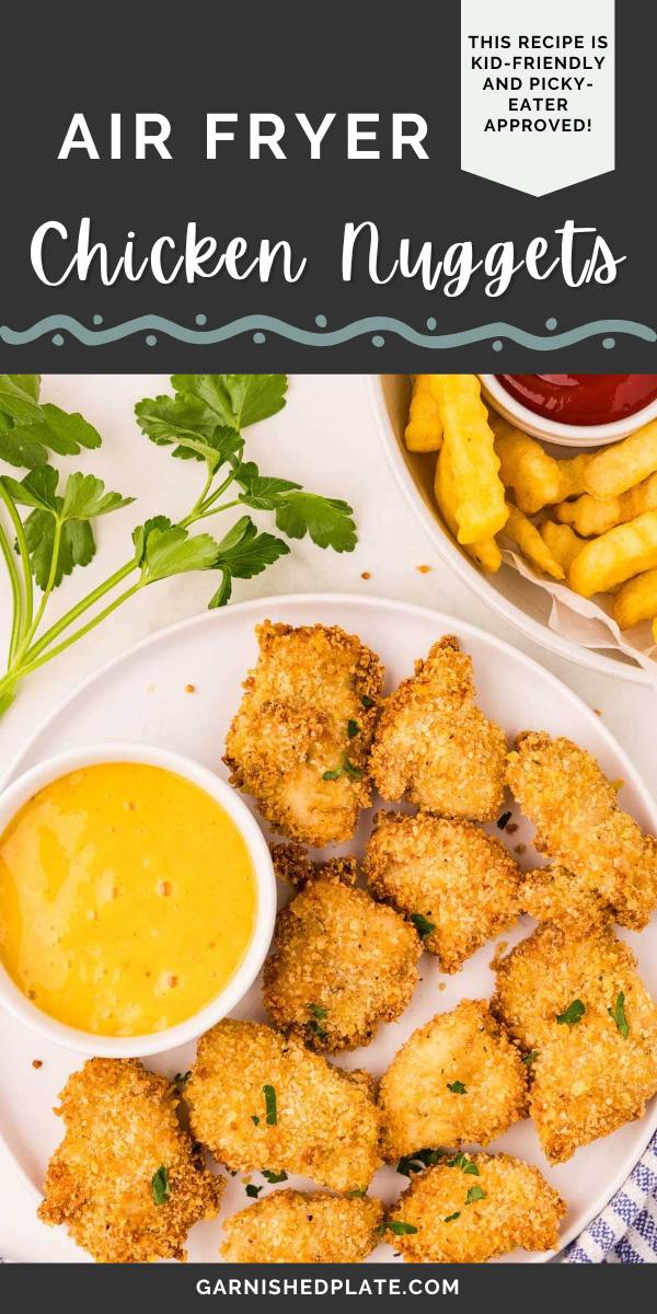 Add a side of Crispy Frozen French Fries or Air Fryer Sweet Potato Fries, or maybe a bowl of Creamy White Cheddar Mac And Cheese and a side salad! Finish your plate with some veggie sticks, or serve your nuggets over a salad or in a wrap for a “grown-up” meal option.