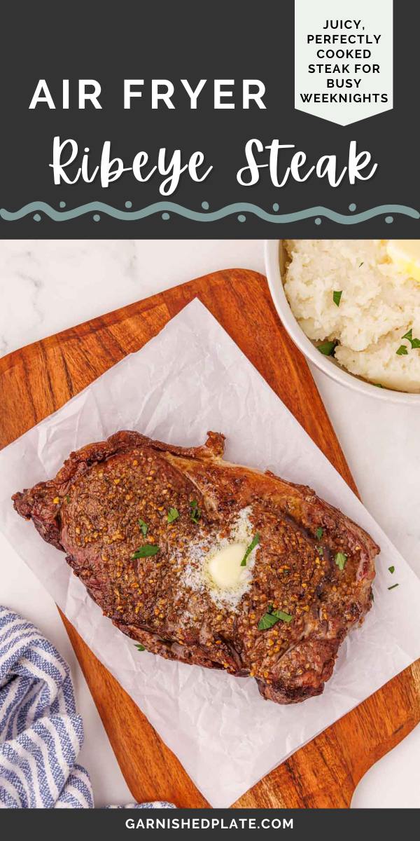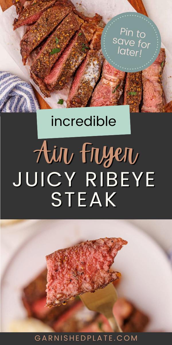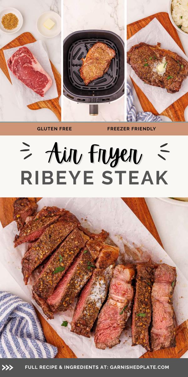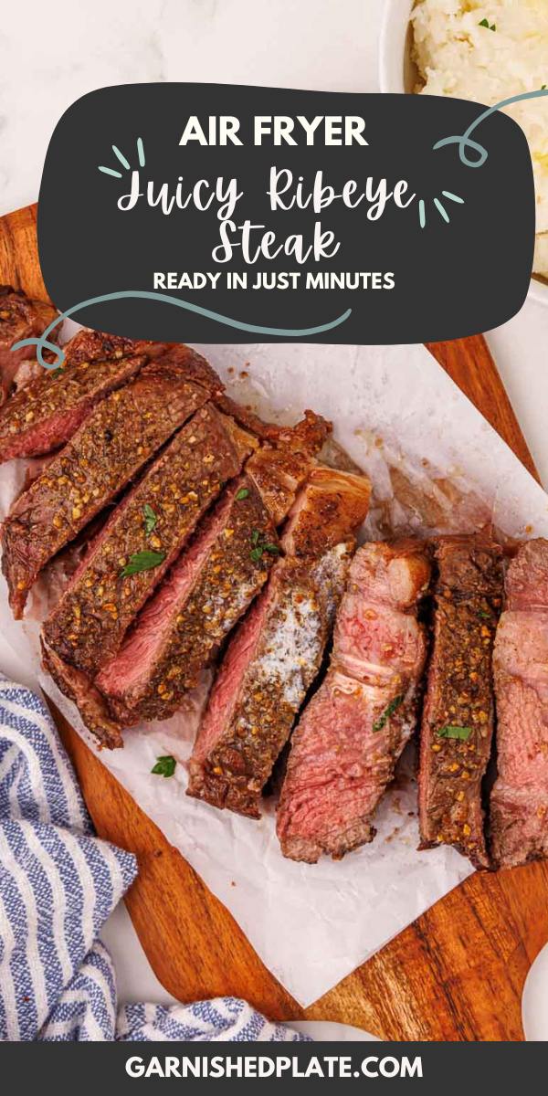 - How do I make sure my air fryer ribeye steak doesn’t get overcooked? It’s important to choose a ribeye steak that is at least 1 inch thick so that it doesn’t cook too quickly (and become tough or dried out). Also, follow the timing for salting the steak (either wait at least 40 minutes or right before cooking) to keep the meat from drying out.