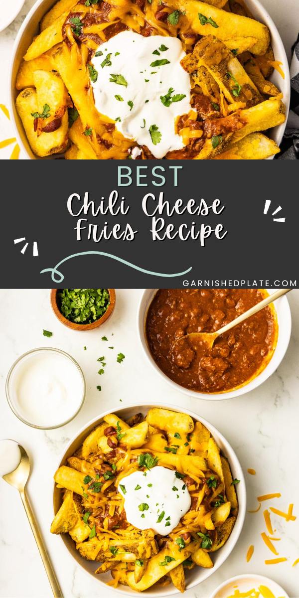 - Serve warmed fries topped with chili, cheese, sour cream, and cilantro