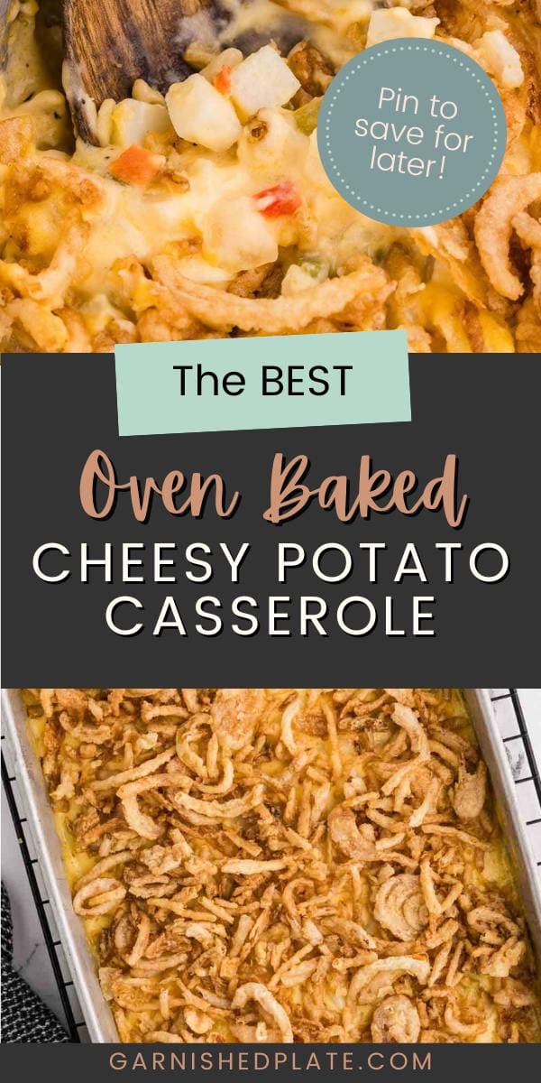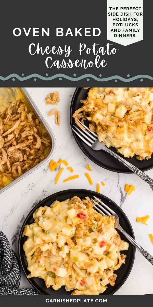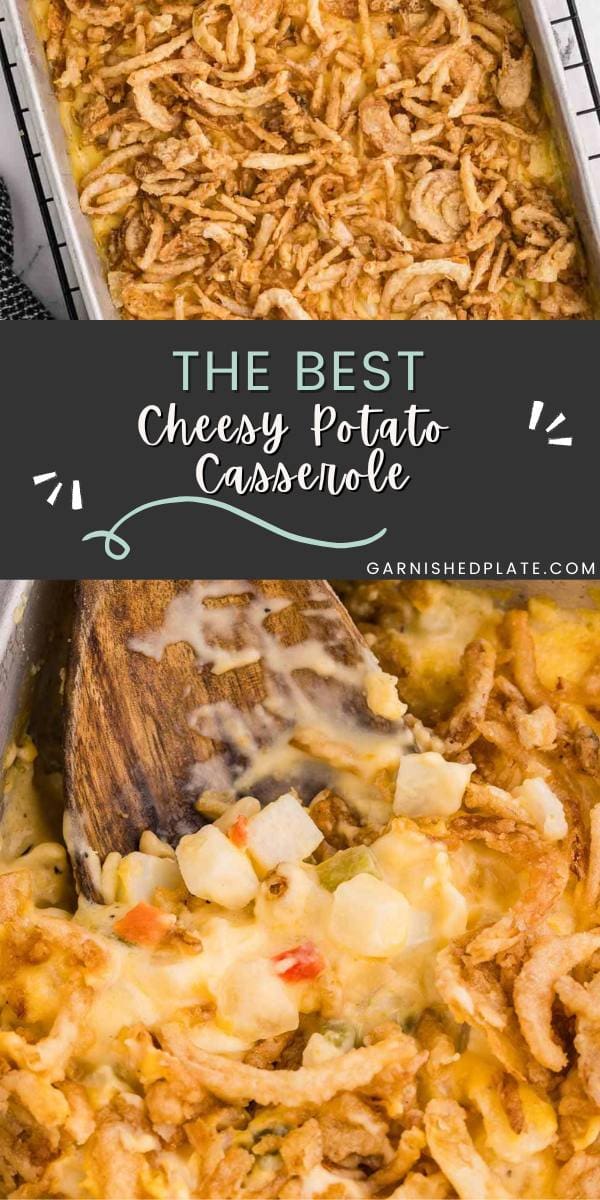 Cheesy potato casserole is a staple dish for family gatherings and potluck-style meals. It works with lots of other dishes, and you could serve it for breakfast, lunch, or dinner!
